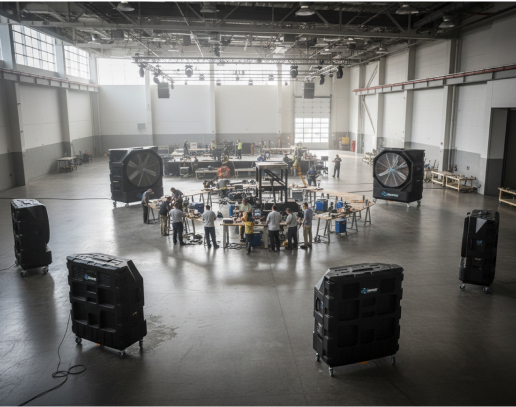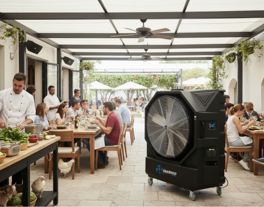 Most effective in open or semi-open areas with good air exchange. Commercial applications include large retail floors and warehousing, restaurants and food service kitchens, gyms and recreation facilities, data center spot cooling, hotels and resort common areas, service bays, aircraft hangars, and event venues. Industrial applications include manufacturing facilities and assembly floors, agriculture and poultry and livestock operations, greenhouses and horticulture facilities, foundries and steel mills, power generation and mining operations, and textile mills — anywhere traditional A/C is impractical, cost-prohibitive, or logistically impossible to deploy at scale.