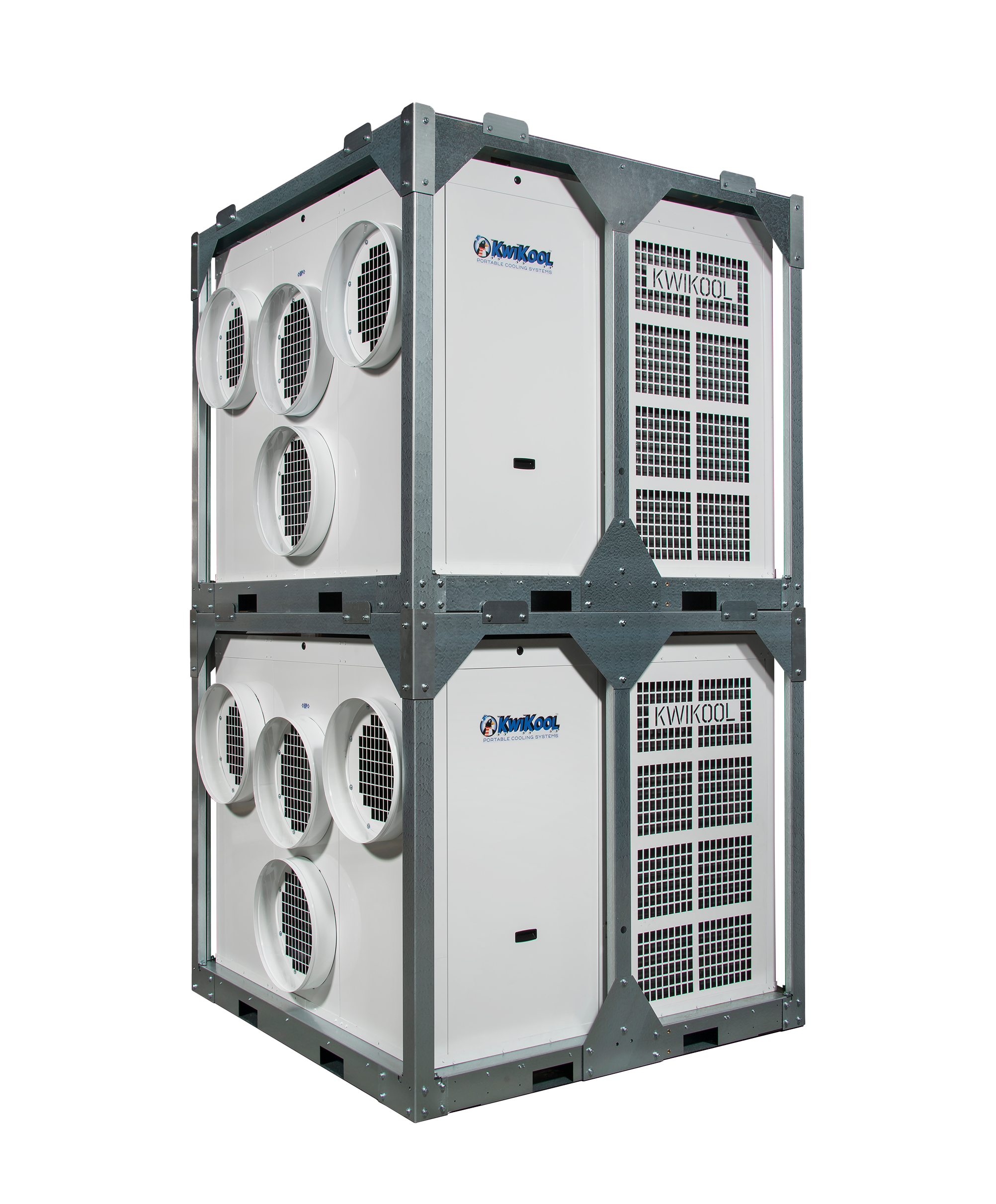 The Model KPO25-43 (25-ton or 270,000 Btu) is the most versatile unit in size and capabilities compared to other portables with similar capacity. The KPO25-43 has an extremely small footprint that is ideal for difficult applications with limited available space. The KPO25-43 model is 66″ wide, 66″ long, and 60″ tall. The heavy-duty 12 gauge steel base offers forklift skid access for easy movement, setup, and transport. Up to eight units can be loaded onto a standard flatbed trailer. The unit is placed outdoors with a duct running into a building space, using high static blowers to reach an isolated heat load. This KPO model offers advanced airflow capabilities, up to 75 feet of 20″ cold air supply, and return ducts, which eliminates the need for the addition of a booster blower.