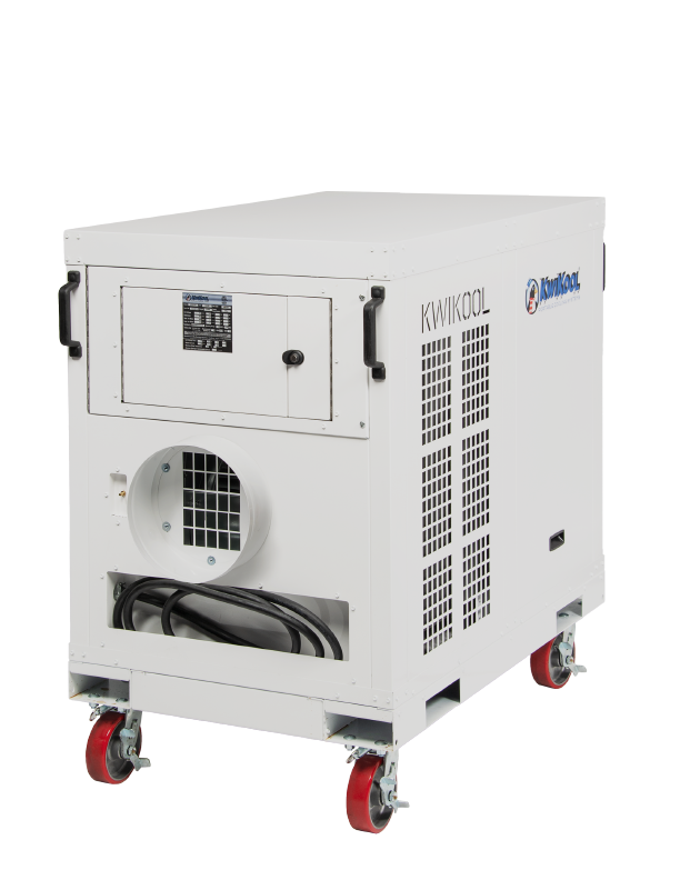 The Model KPO5-23 (nominal 5-ton or 60,000 BTU) is the most versatile unit in size and capacity in The KPO Series, KwiKool’s Indoor/Outdoor Line of portables. The KPO5-23 has an extremely small footprint that is ideal for difficult applications that require moving cold air to a hard to reach heat load, such as a sealed interior room. The unit can be placed outdoors with duct running into a building space or it can be placed inside a building and ducted into an interior space. The KPO Series offers advanced airflow capabilities, up to 50 feet cold air return and supply and up to 65 feet of hot air exhaust ducting. All KPO models are 32 inches wide and will fit through a standard 36-inch door.